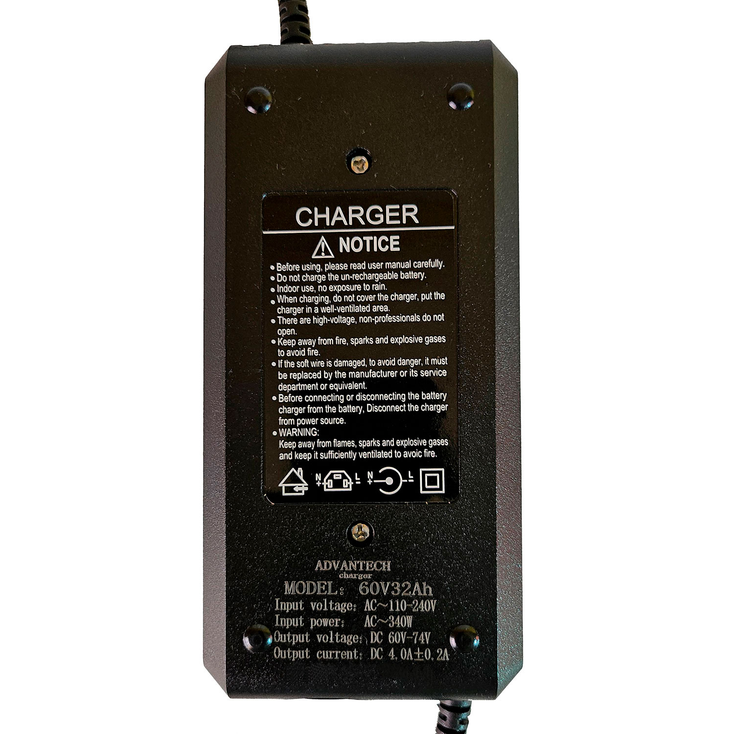 • Cargador exclusivo para de Baterías de plomo-acido, gel o grafeno de 60V 32AH. No usarlo en baterías de litio.