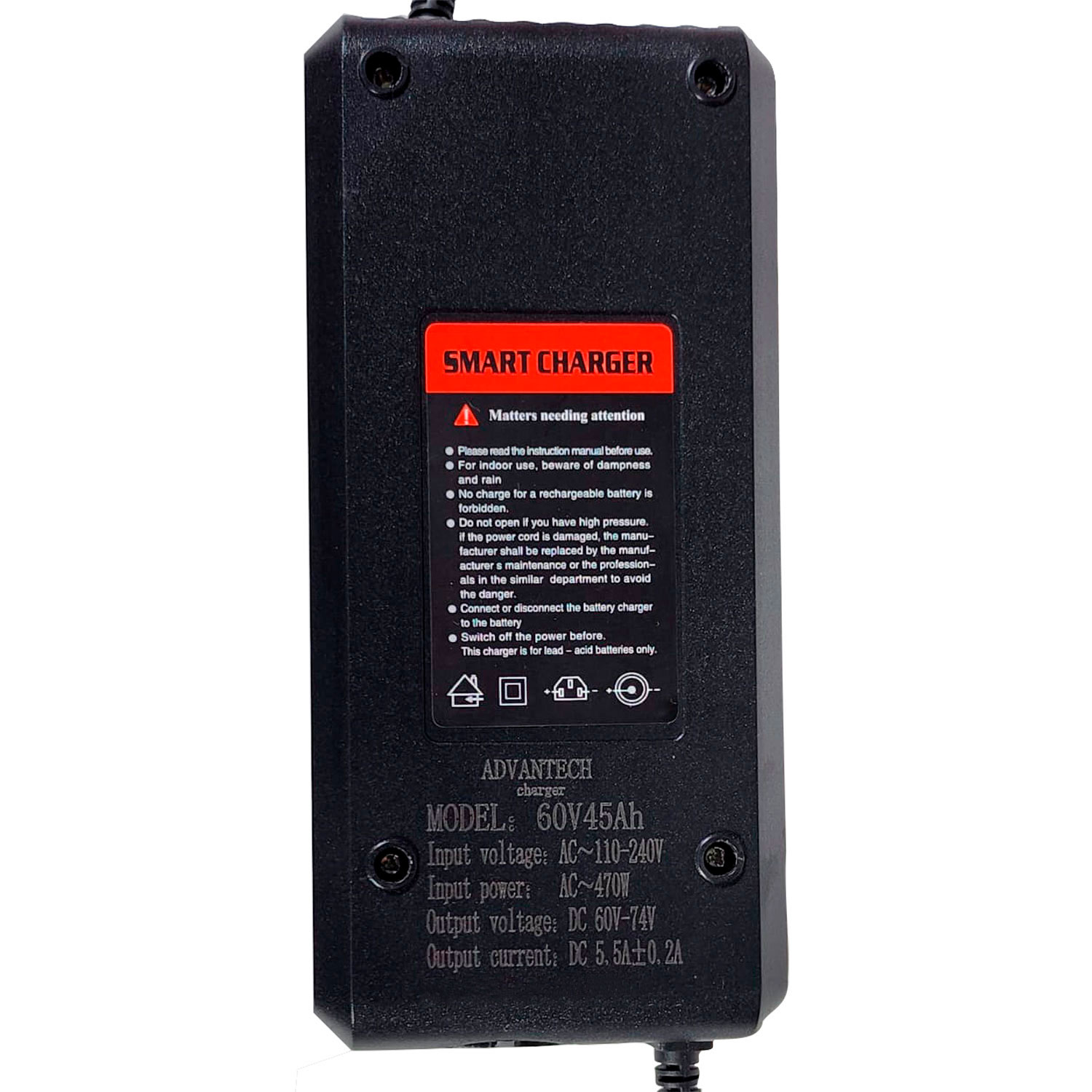 • Cargador exclusivo para de Baterías de plomo-acido, gel o grafeno de 60V 45AH. No usarlo en baterías de litio.